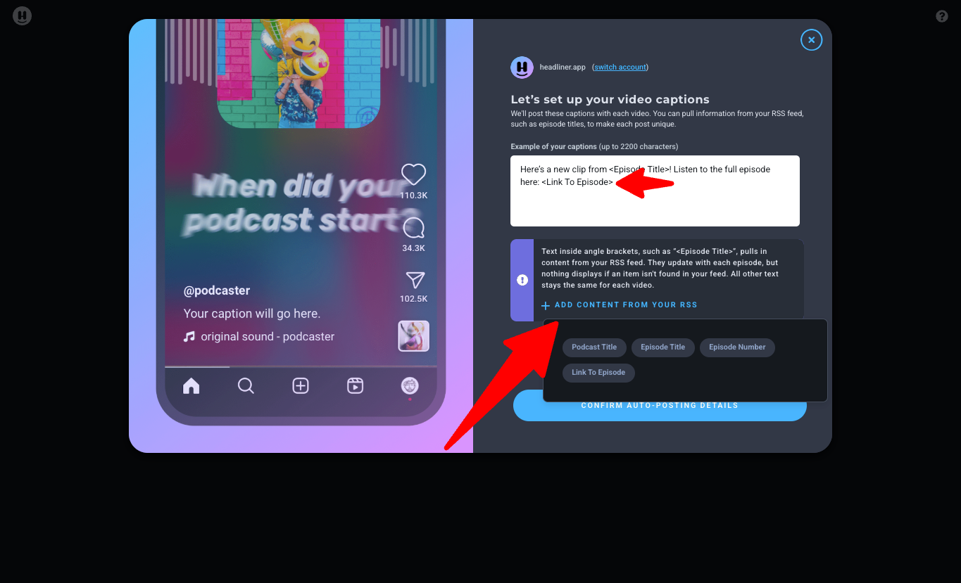 For example, the caption above ‘Here’s a new clip from <Episode Title>! Listen to the full episode here: <Link To Episode>’ is 121 characters. However, once this caption is actually posted, the dynamic elements will fill in, altering the caption. The posted caption will be ‘Grow your show with Headliner! Here’s a new clip from How Guests Spark Engagement: The Perfect Match for Podcast Growth! Listen to the full episode here: https://play.headliner.app/podcast/53fe327002dd4e9b8947be388f61d942/episode/620c88a2-be1f-46f9-8d1a-c2d91c69d9fe.’ This particular caption has 266 characters. Thankfully, this caption is still within Instagram’s caption limits so nothing will get cut off. However, if I were to add two or three hashtags, this particular automation would probably start to get cut off on X or Bluesky.