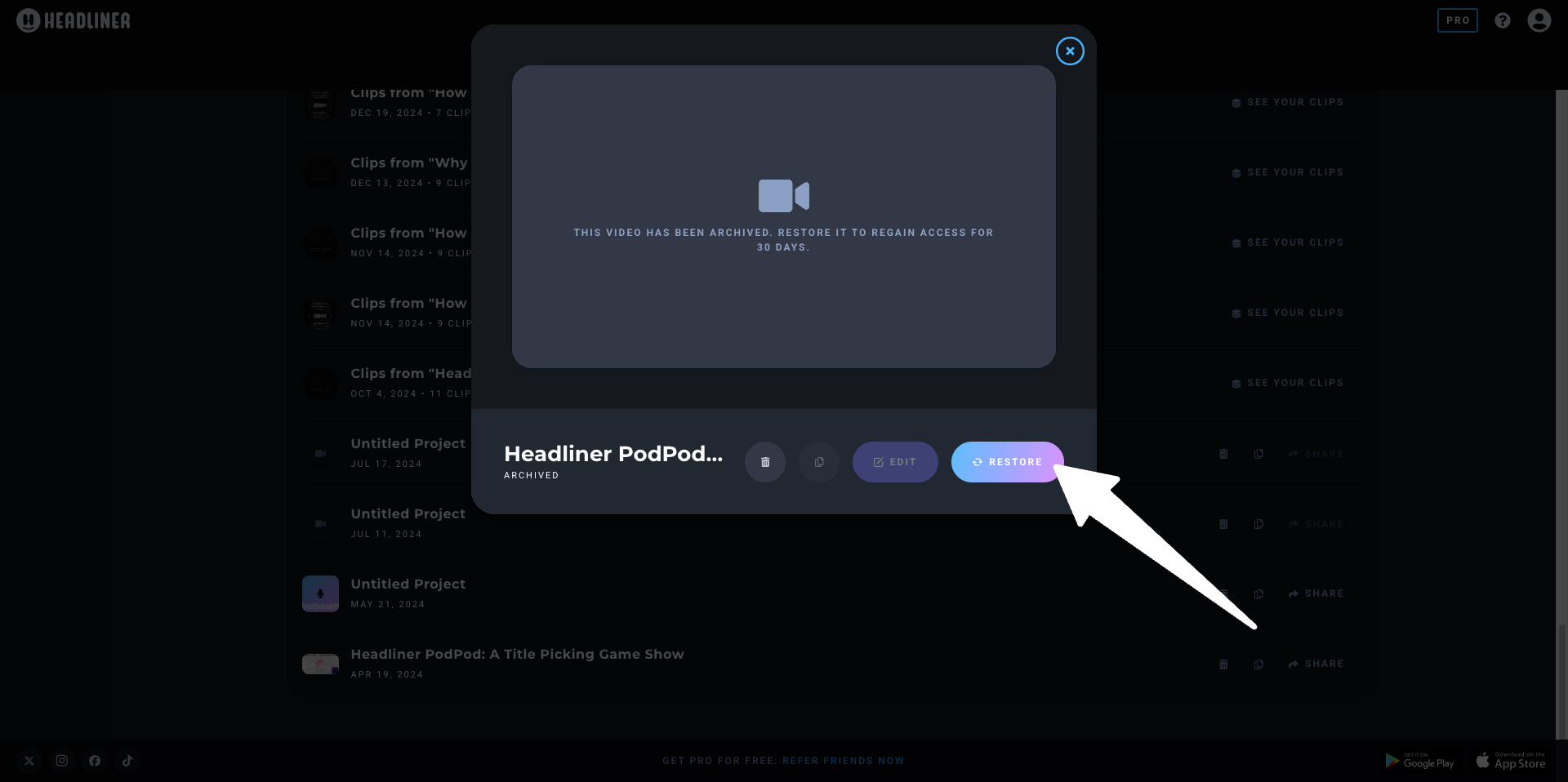 To begin, if you want to restore archived projects in Headliner, you will need to upgrade to Headliner Pro. Please follow on screen prompts or upgrade via your 'My Plan' page in your Headliner account.