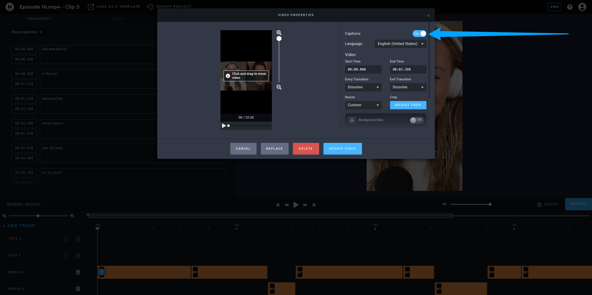 - Enable captions - If you did not already enable captions on your project, you will need to do that. To add captions, click on the asset containing the spoken word. Then, toggle 'Captions' on.