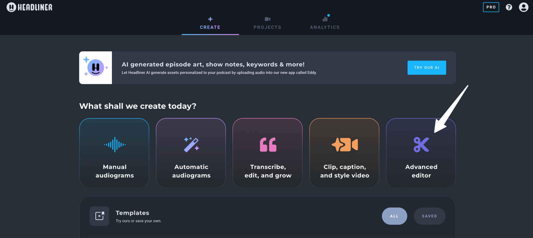 To create a template with the Advanced Editor, first, click on the purple ‘Advanced Editor’ wizard in your Headliner account.