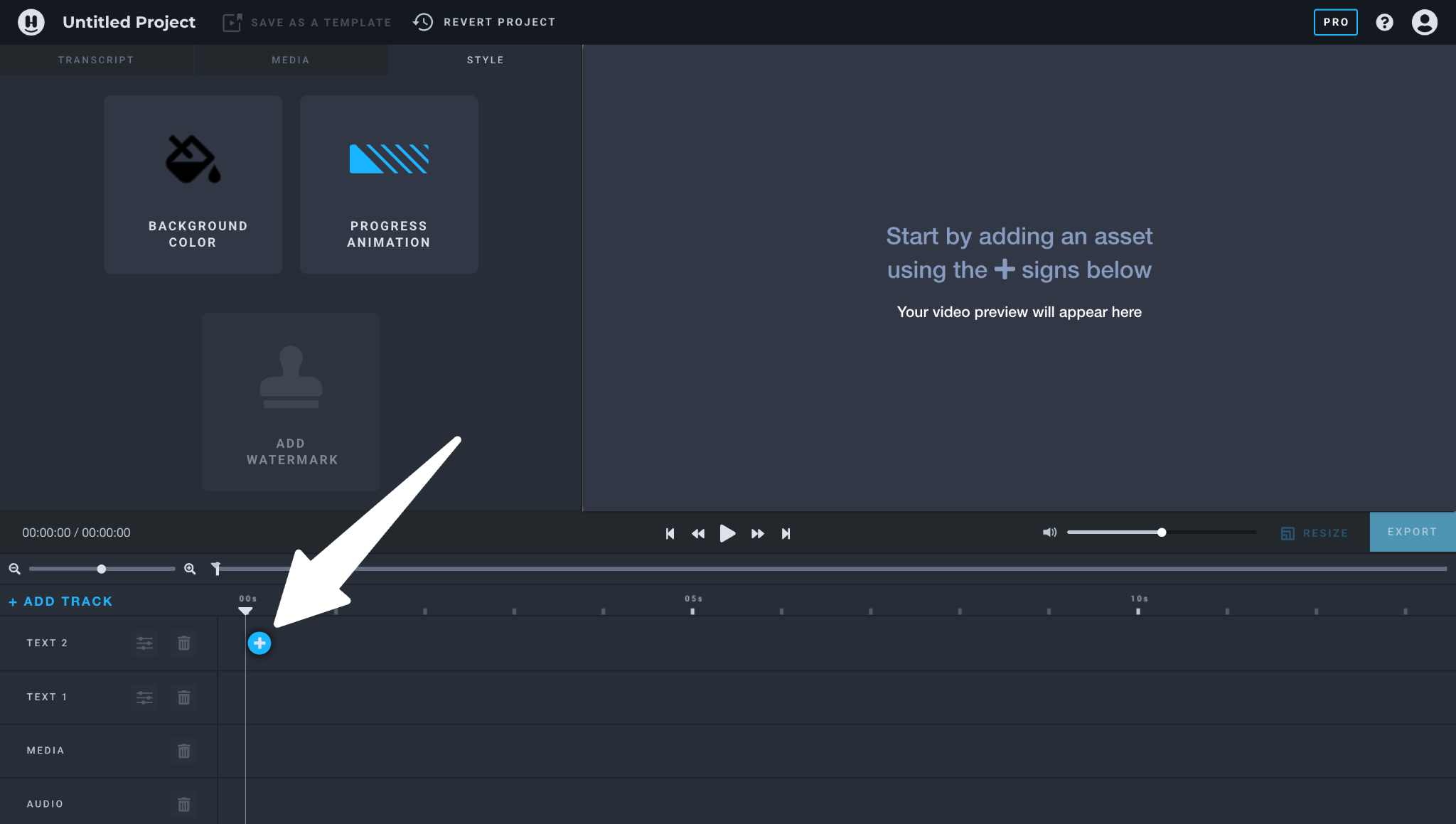 Next, you’ll see a blank project. To start building your template, you’ll need to add assets in the Media Track below. To do so, hover over the asset type (i.e., text, image, audio) and click the blue plus button.
