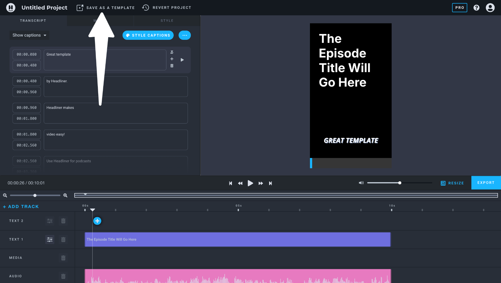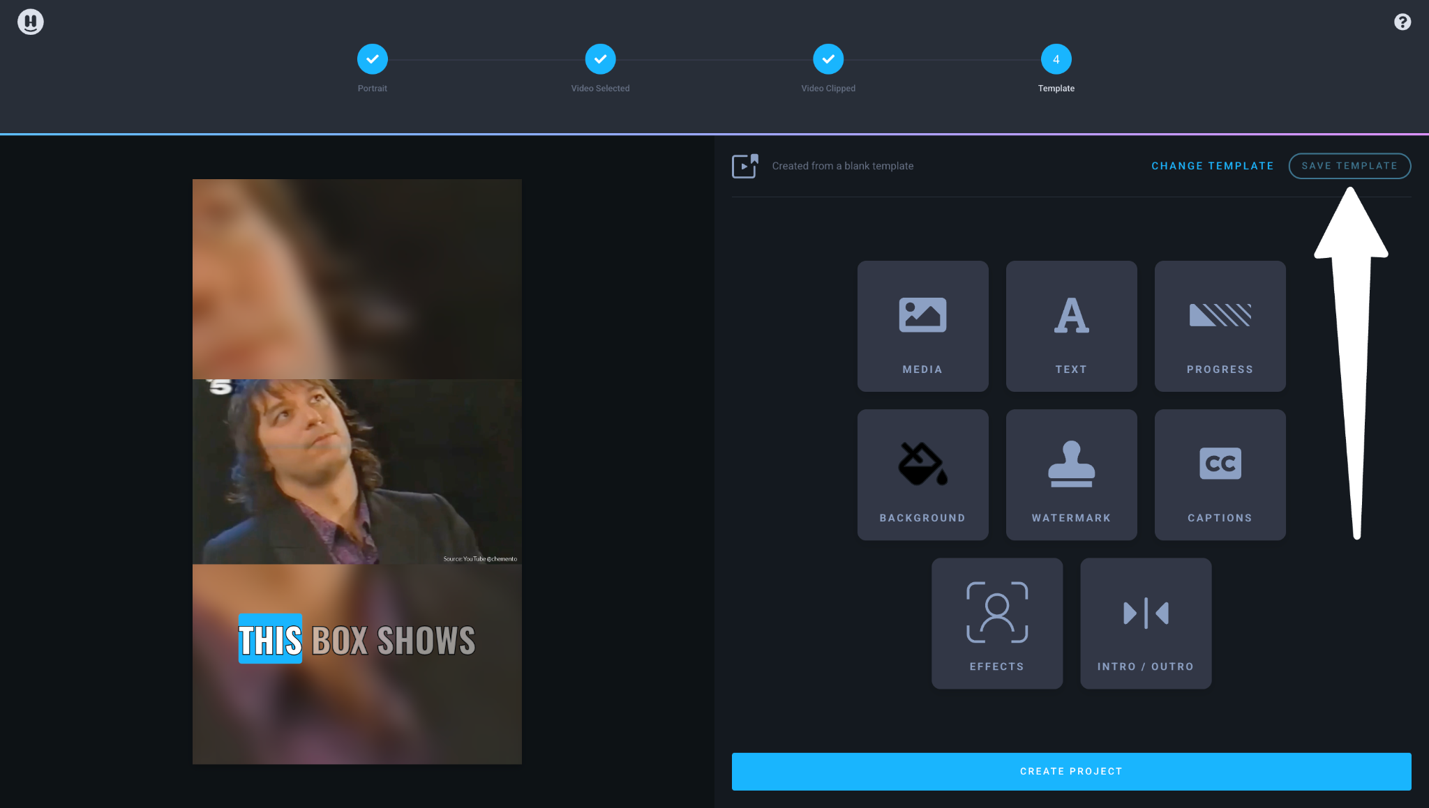 Next comes the fun part: designing your template. Add assets such as your podcast art, caption styles, and progress bars to create templates that showcase your show’s unique style and flair. Once you’re happy with the way things look, click ‘SAVE TEMPLATE’ located in the upper right-hand corner.